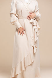 A perfect balance of sophistication and modesty, the Layali Wrap Maxi is designed for those who appreciate luxurious comfort and effortless style. Crafted from premium satin fabric, this dress features a flattering wrap silhouette, delicate ruffle hem, and an adjustable waist tie for a customized fit. The full-length sleeves with tailored cuffs add a touch of refinement, making it a versatile piece for formal events, Ramadan gatherings, and elegant evenings out.